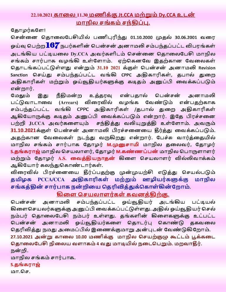 7. GSM line phone வைத்திருப்போரின் Life certificate கொடுப்பது சம்பந்தமாக போன்ற பிரச்னைகளை தீர்க்க முடிவுகள் எடுக்கப் பட்டுள்ளது.